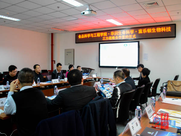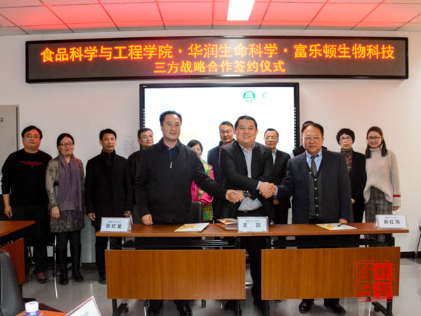 与华润生命科学产业发展有限公司、富乐顿生物工程科技(北京)有限公司在食品楼218举行了产学研战略合作签约仪式。学院党总支书记党登峰,院长张红星,副院长马挺军,华润生命科学产业发展有限公司董事长黄振辉、总经理支喆,富乐顿生物工程科技(北京)有限公司董事长郝红炜等出席签约仪式。仪式由张红星院长主持。