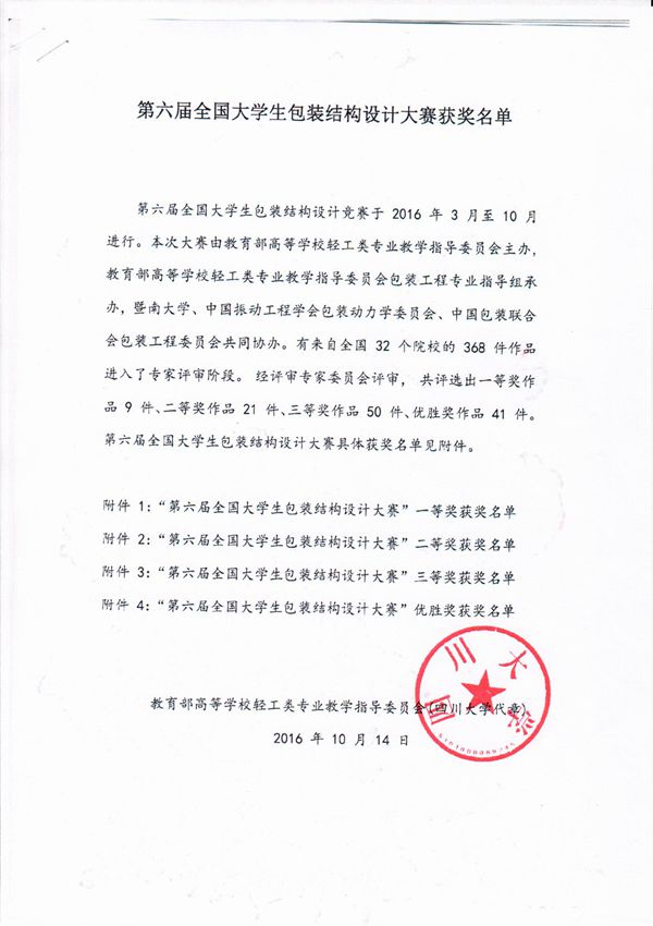 让我们对以上获奖的同学和师生表示祝贺,同时也期待我校师生在2017年全国包装结构设计大赛中再接再厉,为学校争得更高的荣誉。