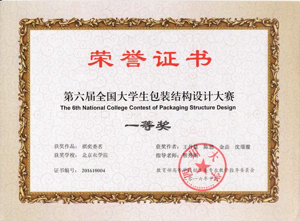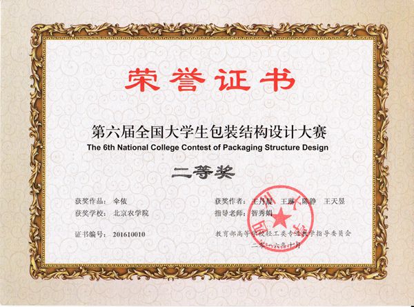 首届包装工程毕业生毕业设计作品中挑选优秀作品并进行优化,共选送4份作品提交给“第六届全国大学生包装结构设计大赛”组委会。经组委会评审,北京农学院学生王丹晨、陈思、金垚、沈璟璇在指导教师智秀娟老师指导下,提交的作品“棋奕香茗”获得全国一等奖。北京农学院学生王丹晨、王琳、陈静、王天昱在指导教师智秀娟老师的指导下,提交的作品“伞依”获得全国二等奖。