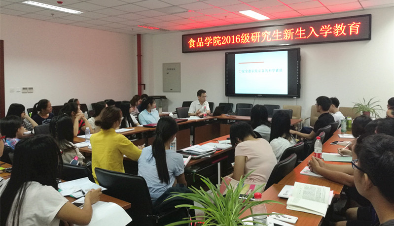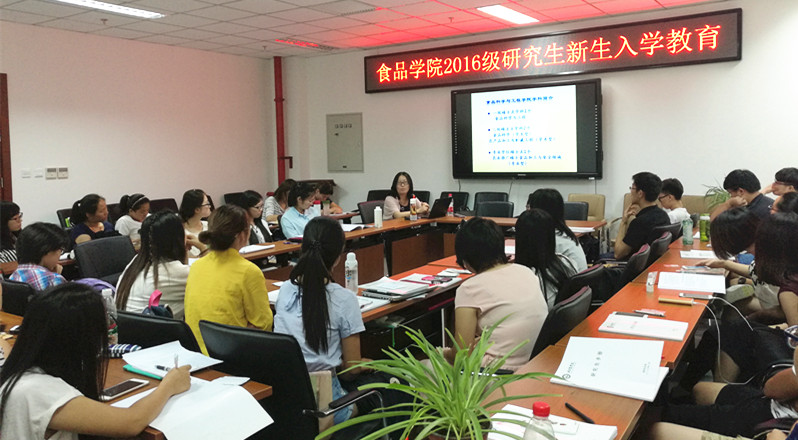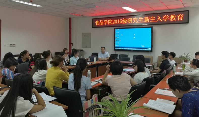 2016年9月8日下午,食品科学院工程学院组织开展2016级全日制硕士研究生新生入学教育活动。学院副院长党登峰,张红星教授、綦菁华教授、王宗义副教授,团委书记刘海燕、研究生秘书段慧霞和全体2016级研究生新生参加了入学教育会。