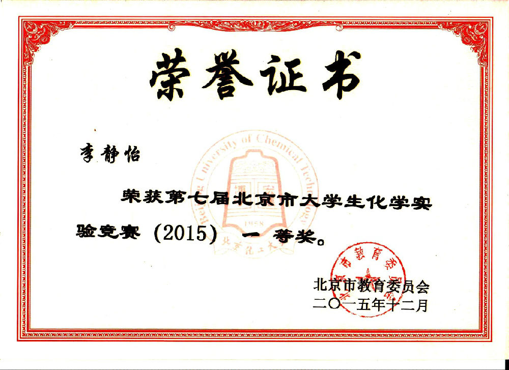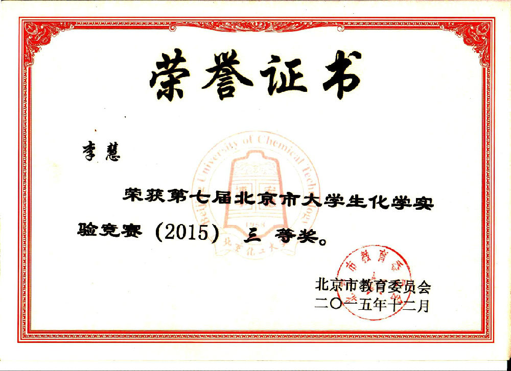 在2015年第七届北京市大学生化学实验竞赛中,我校十名参赛选手再创佳绩,实现我校参赛以来新的突破。我校十名参赛队员全部获奖,且获一等奖五名,二等奖四名,三等奖一名。