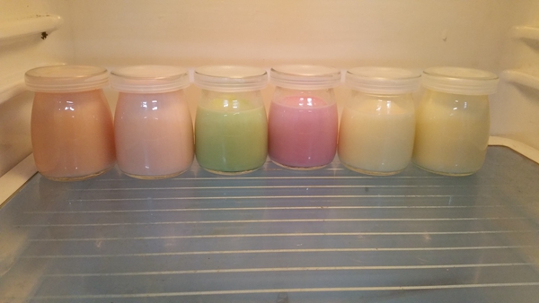 这布丁这么好,是不是有人心动了呢,是不是有人想要自己尝试一番了呢?事实上,五彩益生布丁可不是这么好做的,在初期,团队也是经历了大大小小许多问题。形形色色的益生菌选择,让她们这些“门外汉”花了眼。低头一看,咦,这个色不好看,那个色太淡了。当颜色问题解决了,又突然发现口感上有欠缺。有时就连蔬菜汁也出来捣捣乱,去皮榨汁这种琐屑小事就不提了,蔬菜配比就成了问题,要营养,也要好看,忙得众人焦头烂额。所幸小组成员没有人提出放弃,每有时间小组成员就会来到实验室调配测试,认真的听取熊利霞和许丽老师的指导意见,在多次尝试后,终于制作出了我们今天看到的五彩益生布丁。