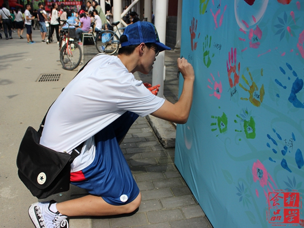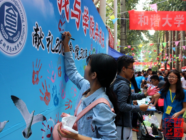这是学院专门针对2015级新生设计的一块送给学院和学校的礼物。“献礼2015学院30年院庆,喜盼2016学校60岁华诞”的字眼让新生们倍感兴奋与自豪,以印手印来献礼的形式让新生们感到新颖与独特。