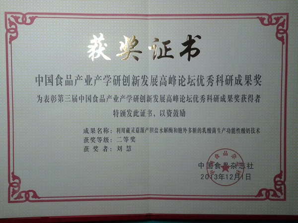 刘慧教授主持的《利用藏灵菇源产胆盐水解酶和胞外多糖的乳酸菌生产功能性酸奶技术》获得优秀科研成果二等奖。