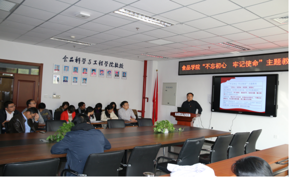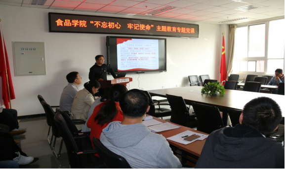 党总支书记党登峰在食品楼218会议室为全体教师党员讲授题为“不忘初心、牢记使命”为学院发展而努力奋斗的主题教育专题党课。