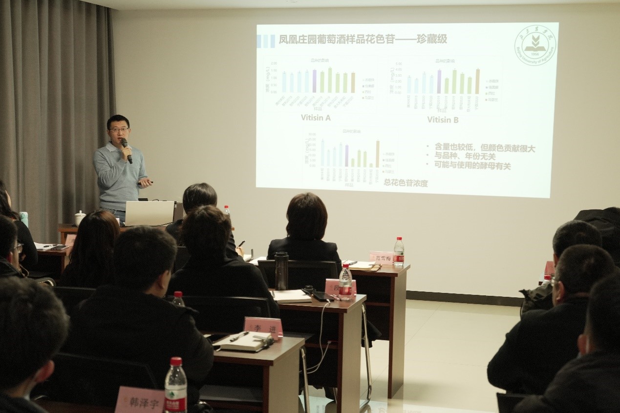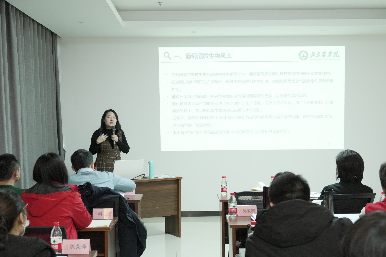 交流培训中,张欣珂首先解读了茅台凤凰庄园前期送检的部分葡萄酒样品检测结果与分析,对其中的酚类物质组成分析进行了专题报告,并就葡萄酒感官评价开展了培训工作。庞晓娜围绕葡萄酒微生物风土和葡萄酒发酵过程中微生物多样性做专题报告。