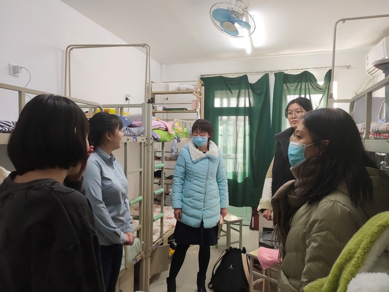 党总支副书记、副院长王雪,副院长丁轲,班主任王昊然、辅导员任墨诺和两名班主任助理分别到学生公寓7号楼和9号楼抽查了卫生和安全工作,特别看望了因疫情延误,首次到校的6名学生。