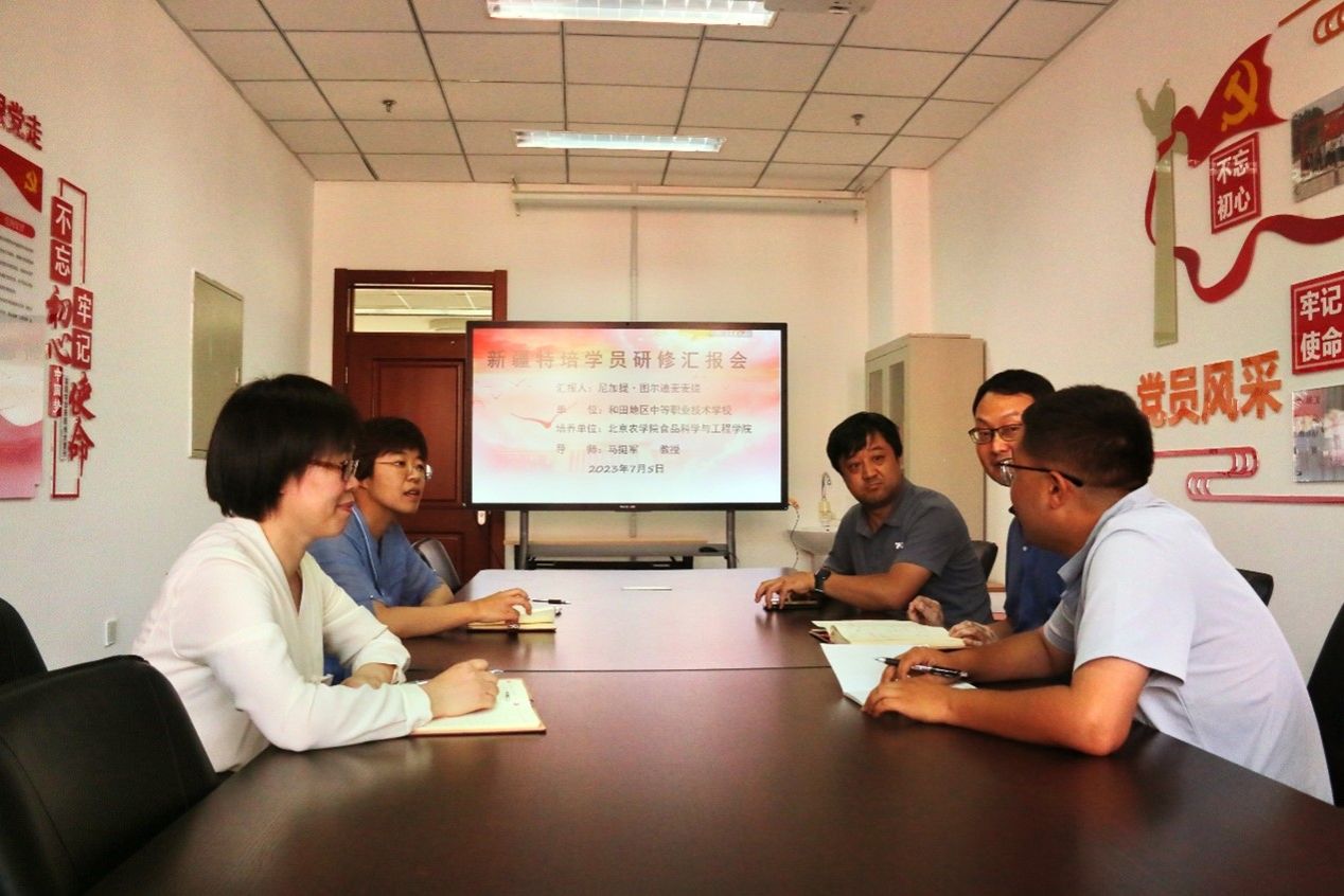 在食品楼214会议室召开2022-2023年度特培学员研修座谈会。学院班子成员、特培学员尼加提·图尔迪麦麦提和部分教师参会。会议由学院党委书记靳晓熙主持。