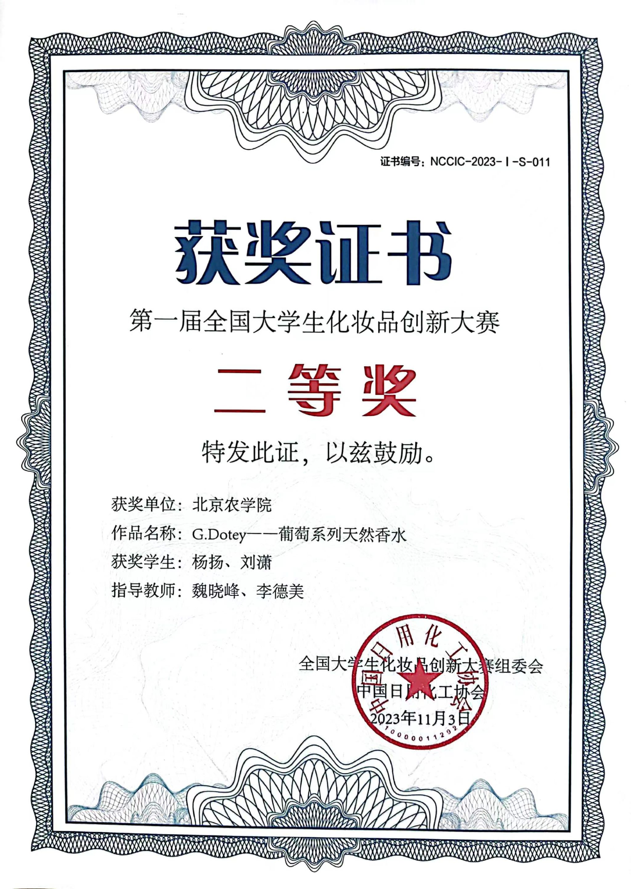 酿酒工程系教师魏晓峰、李德美指导,2021级本科生杨扬、刘潇负责的“G.Dotey-葡萄系列天然香水”项目在第一届全国大学生化妆品创新大赛总决赛中斩获二等奖。
