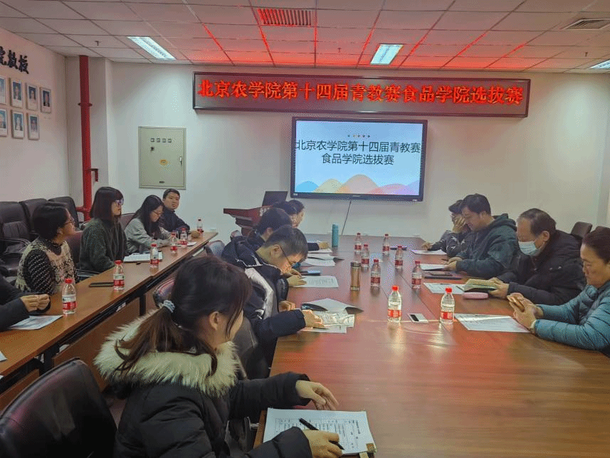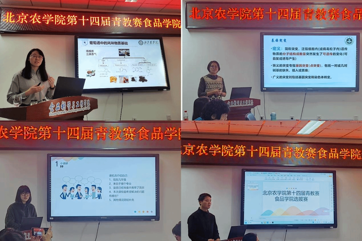 在食品楼F218举行青年教师教学基本功比赛。艾启俊、徐艺青、贾友苏、刘慧等4名校、院教学督导担任评委,教学副院长丁轲,高秀芝、徐广谦、庞晓娜等3位系主任以及学生代表也作为评委参加了比赛。